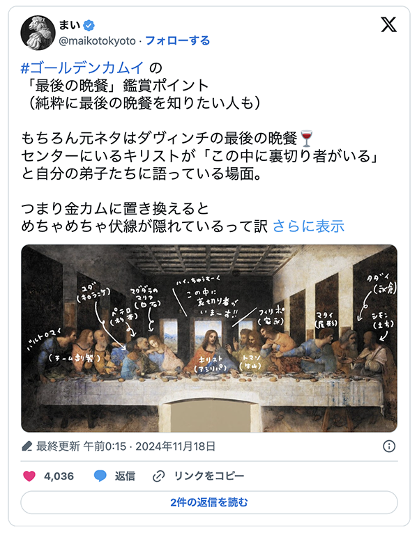 レオナルドダヴィンチとゴールデンカムイの「最後の晩餐」を見比べてみた。